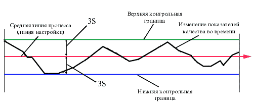 Контрольные карты – специальный вид диаграммы, впервые предложенный В. Шухартом в 1925 г. Контрольные карты имеют вид, представленный на рис. 4.12. Они отображают характер изменения показателя качества во времени.