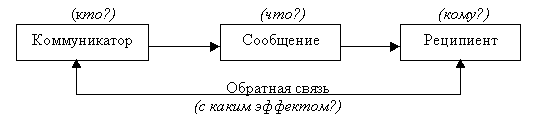 В самом общем виде модель простой или межличностной коммуникации состоит из следующих основных элементов: коммуникатор (кто?; передающий сообщение), сообщение (что?; содержание послания в знаковой либо иной форме) и реципиент (кому?; адресат, принимающий сообщение).