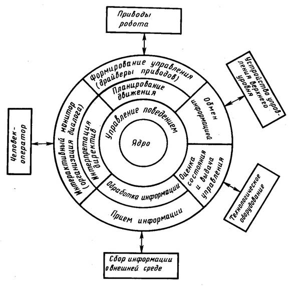Функции программного обеспечения адаптивного робота состоят в обслуживании внешних по отношению к системе управления объектов: человека-оператора, приводов робота, информационной системы, технологического оборудования и вычислительного устройства верхнего уровня управления (рис.3).