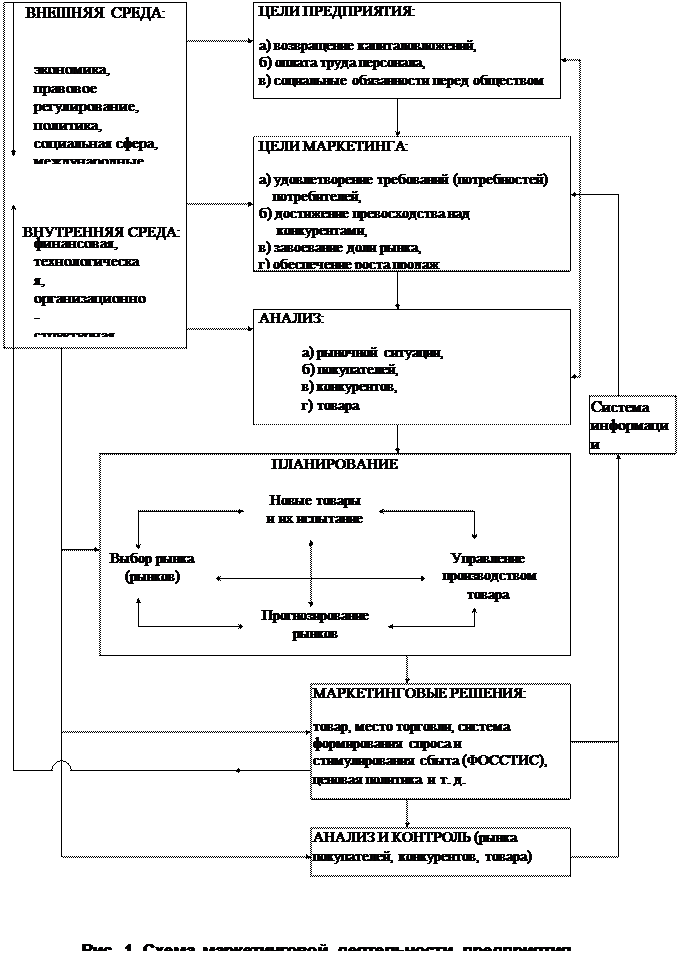Маркетинг, как порождение рыночной экономики, является в определенном смысле философией производства, полностью (от научно-исследовательских и проектно-конструкторских работ до сбыта и сервиса) подчиненной условиям и требованиям рынка, находящимся в постоянном динамическом развитии под воздействием широкого спектра экономических, политических, научно-технических и социальных факторов. Предприятия-производители и экспортеры рассматривают маркетинг как средство для достижения целей, фиксированных на данный период по каждому конкретному рынку и его сегментам, с наивысшей экономической эффективностью. Однако это становится реальным тогда, когда производитель располагает возможностью систематически корректировать свои научно-технические, производственные и сбытовые планы в соответствии с изменениями рыночной конъюнктуры, маневрировать собственными материальными и интеллектуальными ресурсами, чтобы обеспечить необходимую гибкость в решении стратегических и тактических задач, исходя из результатов маркетинговых исследований. При этих условиях маркетинг становится фундаментом для долгосрочного и оперативного планирования производственно-коммерческой деятельности предприятия, составления экспортных программ производства, организации научно-технической, технологической, инвестиционной и производственно-сбытовой работы коллектива предприятия, а управление маркетингом - важнейшим элементом системы управления предприятием.