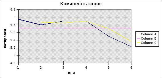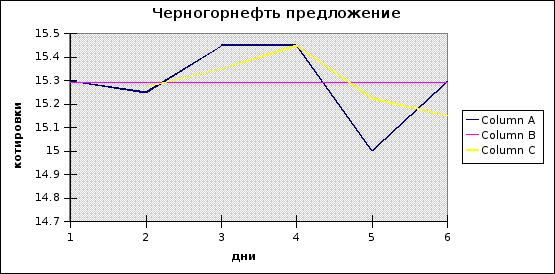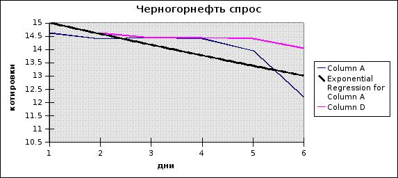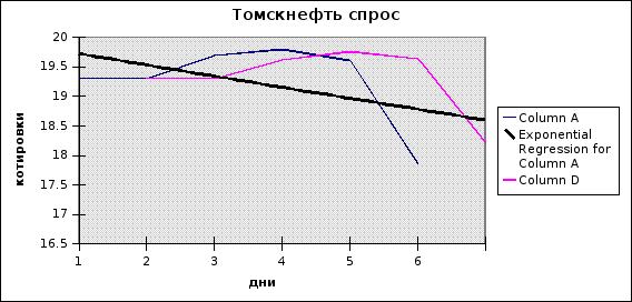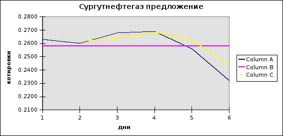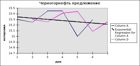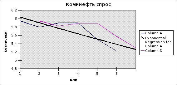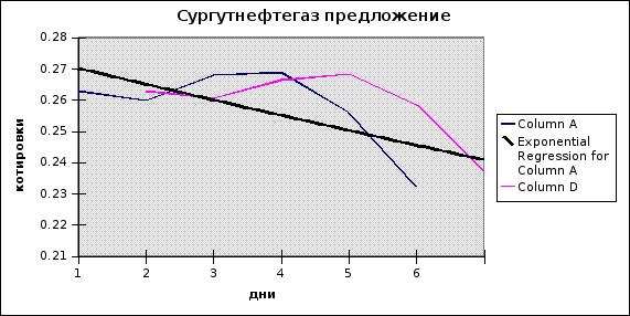 Мы исследуем рынок ценных бумаг, данные взяты с сервера Московской фондовой биржи (адрес - www.rmg.ru). Полученные данные котировок акций крупнейших нефтекомпаний мы вводим в рабочий лист Exel (Приложение 1.). Чтобы понять, существует ли какая-либо определенная тенденция изменения котировок, мы создали на основе средних данных о полученных котировках скользящее среднее (Приложение 2). Скользящее среднее сглаживает смещения базовой линии, лежащей в его основе. Мы решили воспользоваться двухдневным скользящим среднем, то есть среднее значение от котировок двух предыдущих дней.
