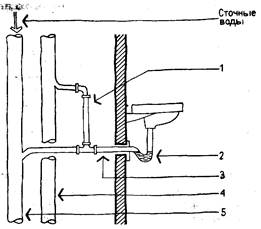 1— вентиляция сантехнического прибора; 2— сифон; 3— канализационная труба; 4— стояк канализационной вентиляции, 5— канализационный стояк