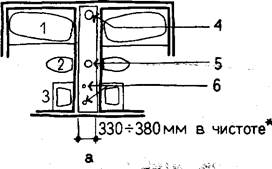 б — расположение двух ванных комнат у одной стены (с каналами вытяжной вентиляции);