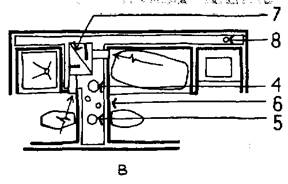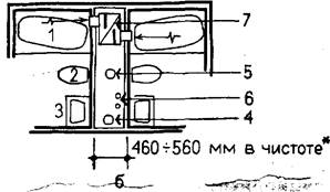| 1— ванна; 2— унитаз; 3— умывальник; 4— вентиляционный стояк; 5— канализационный стояк; 6— стояки вентиляционного и горячего водоснабжения; 7—каналы вытяжной вентиляции; 8—стояк бытовой канализации (не фекальной); 9— раковина; 10— стояки бытовой канализации и канализационной вентиляции