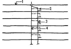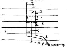 | 1— крыша; 2— раковин»; 3— стояк бытовой канализации; .4— стояк канализационной вентиляции; 5— дополнительный стояк бытовой канализации; 6—нижний жилой этаж; 7—самая нижняя раковина канализуется в вентиляционный стояк; 8— параллельный участок (3 м)