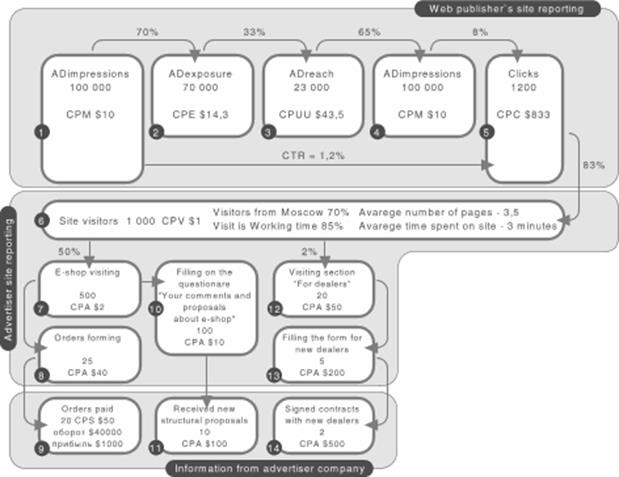 При обработке логов веб-издатель отрапортовал рекламодателю, что за неделю сервер посетило около 33 000 уникальных пользователей, количество кликов на баннер составило 1200, соответственно CTR баннера 1,2% (1200 кликов / 100 000 показов).