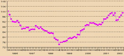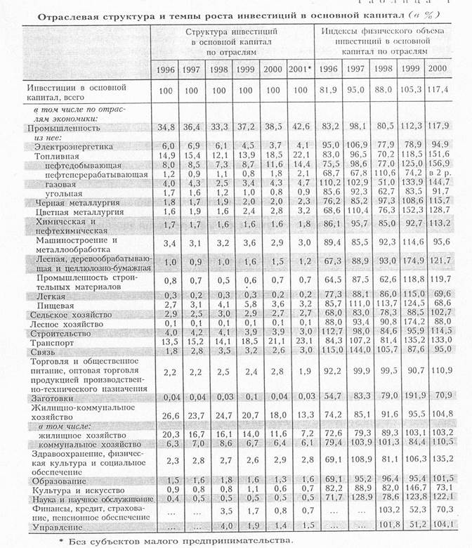 Спад в инвестиционной сфере в ходе затянувшегося трансформационного кризиса в России был наиболее глубоким и драматическим. Если в 1998 г., когда снижение производства было наибольшим, ВВП, согласно официальной статистике, составлял 61%, объем промышленного производства - 50% по отношению к уровню 1991 г., то инвестиции в основной капитал достигали только 25%, в том числе прямые инвестиции производственного назначения - всего лишь 15% от уровня 1991 г.