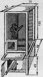 Клетки для птиц должны быть простые, без всяких украшений, лучше четырехугольные, с куполообразным или плоским верхом. Дно клетки делают двойное: нижнее неподвижное—из досок или фанеры, а выдвижное — из оцинкованного железа, с деревянными бортиками; стенка и потолок клеток — из металлических прутьев, укрепленных на деревянном каркасе. Расстояние между прутиками обычно 10—12 см. В клетке укрепляют 3—5 жердочек, которые делают из гладко выструганных палочек диаметром о 8 мм, чтобы птица могла плотно обхватывать их пальцами на три четверти. Располагают жердочки так, чтобы они не приходились над кормушкой и поилкой.