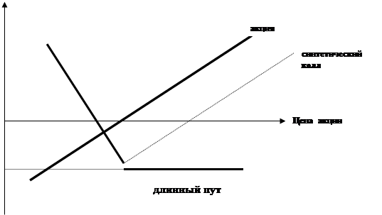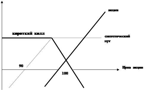 Как следует из графика, такое хеджирование позволяет ему застраховаться от повышения курса акций только на величину полученной от продажи опциона колл премии (10 $). Данная стратегия представляет собой не что иное, как синтетический короткий пут.
