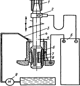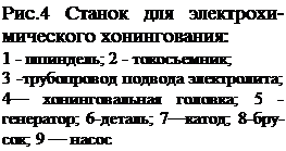 Для значительного повышения производительности хонингования разработан способ электрохимического хонингования, при котором на механическое воздействие брусков накладывается эффект электрохимического (анодного) растворения металла. Одной из схем электрохимического хонингования является обработка брусками на токопроводящей связке: металлической и бакелитовой с графитным наполнителем. Однако при такой схеме часто наблюдается электроэрозионные явления на контакте брусок- деталь вследствии малого зазора, равного высоте выступающей части абразивных зерен и большой поверхностью контакта. Поэтому наиболее широкое распространение получила схема со специально установленными в хонинговальной головке катодами и нетокопроводящими или изолированными брусками (рис.4). Конструкция станка для электрохимического хонингования мало отличается от конструкции обычного хонинговального станка. Число оборотов, скорость возвратно-поступательного движе-ния, механизм радиальной подачи хонин-говальных брусков примерно одинаковы. Некоторые различия, обусловленные особен-ностями электрохимического процесса, состоят в том, что от отрицательного полюса источника ток медно-графитовыми щетками с помощью коллектора на вращающемся шпинделе подводится к хонинговальной головке. Приспособление с обрабатываемой деталью подключено к положительному полюсу. В качестве источников тока могут быть использованы низковольтные генераторы постоянного тока и выпрямители, рассчитанные на силу тока 1000—10 000 А, позволяющие бесступенчато регулировать напряжение от 5 до 18В. Детали станка, находящиеся в контакте с электролитом, изготовлены из коррозионно-стойких сталей.