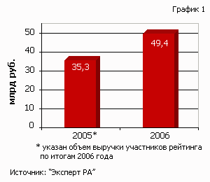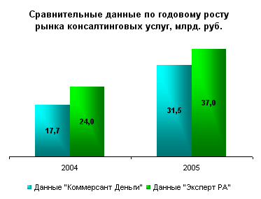 Согласно исследованию «Коммерсант Деньги», рынок консалтинговых услуг показал в 2005 г. почти двукратный рост, составив 31,49 млрд. руб. против 17,72 млрд. руб. в 2004 г. Агентство «Эксперт РА» приводит сопоставимые цифры: 37 млрд. руб. в 2005 г. против 24 млрд. руб. в 2004-м, т.е. рост 54%. (Диаграмма 1