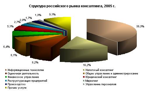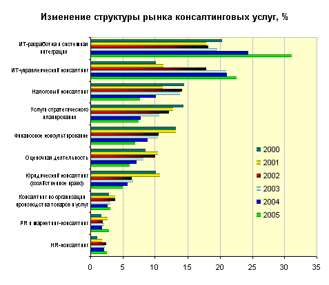 В качестве наиболее динамично растущих секторов консалтингового рынка в 2005 г. «Коммерсант деньги» указывает на консалтинг в сфере производства, оценочную деятельность и налоговый консалтинг. Эти изменения, как и рост ИТ-консалтинга, исследователи связывают с реорганизацией крупных корпораций в различных отраслях. Источником дополнительного спроса на налоговый консалтинг послужила также реформа налогового законодательства.