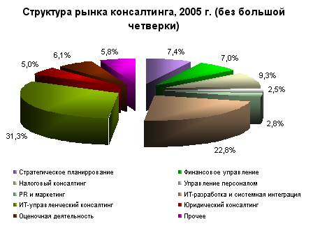 Если же говорить о представленности на рынке различных секторов консалтинга, то, по данным «Коммерсант Деньги», по итогам 2005 г. сложилась следующий расклад (Диаграмма 5