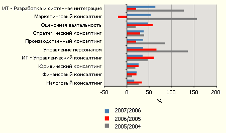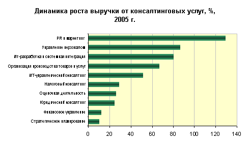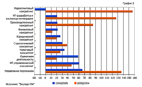 По данным «Эксперт РА», помимо консалтинга в области производства, стремительный рост продемонстрировали услуги в области маркетинга и отношений с общественностью (двукратный рост против 37% в 2004 г.) и в сфере управления персоналом (рост почти 90%).