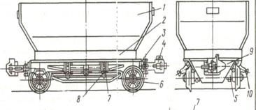 Н7; поперечные колесные блоки 5 для размещения амортизаторов подвески и крепления колёсных пар 6; кронштейнов 7 подвески днищ и затворов 8. По торцам имеются упоры 9 для проталкивания вагонеток толкателем вагонетка имеет ролики затворов 10, с помощью которых происходит раскрытие днищ на разгрузочных кривых.
