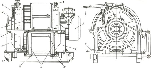 с угольником 3 служат опорами барабана лебедки 4. Электродвигатель 7 и редуктор расположены внутри барабана 4. Тормозная система состоит из двух тормозов(5,6) и предохранительного стопора 9, установленного на раме. Стопор и один тормоз воздействует непосредственно на барабан, а другой тормоз – на шкив фрикциона. Тормоз 6 представляет собой стальную ленту, соединенную с тормозной лентой. Концы этой лены стягивают рычажным устройством, к которому присоединена ручка 8. К тормозу 5, расположенному на шкиве, присоединен механизм 13 для дистанционного включения (отключение) барабана. Механизм дистанционного управления смонтирован на кронштейне 2, а рамка 12, служащая для направления каната, закреплена на раме и угольниках. Направляющая рамка имеет два горизонтальных 10 и два вертикальных 11 ролика, которые предохраняют канат от истирания.