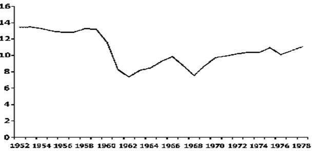 показывает, что темпы экономического роста не зависят от структуры занятого населения. При доле занятых в сельском хозяйстве на уровне, близком к 70,5% (Китай в 1978 г.), значения среднегодовых темпов экономического роста в разных странах колеблются от -6,0% до +8,2%. Следовательно, структура занятости не объясняет высокие темпы экономического роста в Китае.