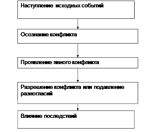 Конфликт можно рассматривать в узком и широком смысле слова.В узком – это непосредственное столкновение сторон. В широком – это развивающийся процесс, состоящий из нескольких этапов: [2, с.204]