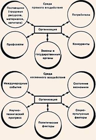 Внешняя среда организации включает такие элементы как потребители, конкуренты, правительственные учреждения, поставщики, финансовые организации, источники трудовых ресурсов, значимые по отношению к операциям организации. [20]