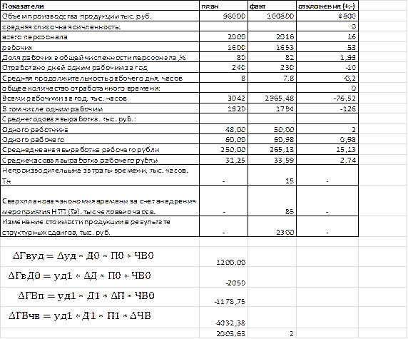 Вывод: Расчеты показывают что среднегодовая выработка работника предприятия выше плановой на 2 тыс. рублей. Она возросла на 1,2 тыс. рублей в связи с увеличением доли рабочих, в общей численности персонала и 4,03 тыс. рублей за счет повышения среднечасовой выработки рабочих. Отрицательно на её уровень повлияли целодневные и внутрисменные потери рабочего времени, в результате она соответственно уменьшилась на 2,05 и 1,18 тыс. рублей.