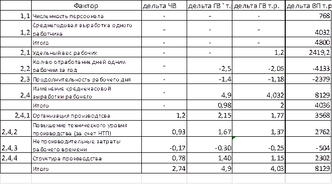 Среднегодовая выработка одним работником величина её зависит от доли рабочих в общей численности персонала, количества отработанных дней, и продолжительности рабочего дня, а также от часовой выработки рабочих: