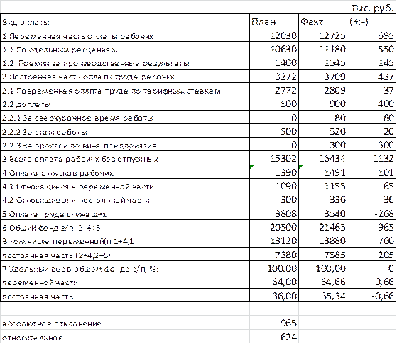 Таким образом за отчетный период по сравнению с планом допущен абсолютный перерасход ФЗП в размере 965 т.р. и относительное перерасход в размере 624 т.р.