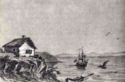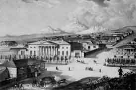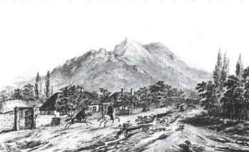 И вот Горячеводск. Горячая гора, вся в известковых потеках, дымится от бегущих по ней серных ручейков... Позади возвышается Машук... На одной из открытых площадок его - казацкий дозорный пост. От подошвы Машука начинается Главная улица, пересеченная несколькими переулками. Дома почти все из тонкого леса, отштукатуренные и выбеленные, с камышовыми крышами. Несколько казенных зданий только строится, - солдаты пилят известняк здесь же, на Машуке. Городок охраняют егеря и казаки, расположившиеся с двумя пушками у въезда.