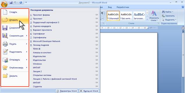 Для открытия недавно открывавшегося файла можно выбрать его в списке Последние документы