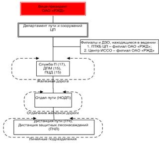 Структура управления путевого хозяйства строится по функционально-территориальному принципу. На уровне центрального аппарата ОАО «РЖД» – Департамент пути и сооружений ОАО «РЖД» (далее ЦП), находящийся в ведении вице-президента по инфраструктуре. На уровне филиалов ОАО «РЖД» в непосредственном ведении ЦП находятся Проектно-технологическо-конструкторское бюро по пути и путевым машинам – филиал ОАО «РЖД» (ПТКБ ЦП) и Центр обследования и диагностики инженерных сооружений – филиал ОАО «РЖД» (Центр ИССО). На уровне железной дороги – служба пути железной дороги (П), являющаяся подразделением органа управления железной дороги и подчиняющаяся заместителю начальника железной дороги по путевому хозяйству. В ведении службы пути железной дороги находятся следующие структурные подразделения: