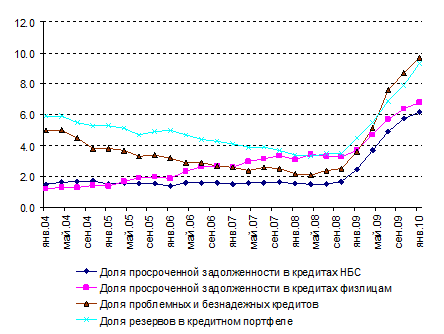 : объем просроченной задолженности предприятий и организаций только в течение 2008 года увеличился в три раза с 86 до 266 млрд. рублей. На начало 2010 просрочка предприятий достигла 762 млрд. рублей и продолжает, хотя значительно меньшими темпами, увеличиваться. Доля просроченной задолженности в портфеле кредитов нефинансовым предприятиям выросла с 0,9% на начало 2008 года до 6,5% на 1 апреля 2010 года[4]