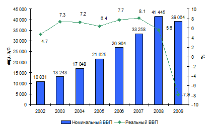 Объем ВВП России за 2009 год, согласно данным Росстата, составил в текущих ценах 39 трлн. 064 млрд. рублей, а падение его реального объема относительно 2008 года – 7,9%. Падение российской экономики в 2009 году было отмечено впервые с 1998 года, что стало следствием мирового экономического кризиса.
