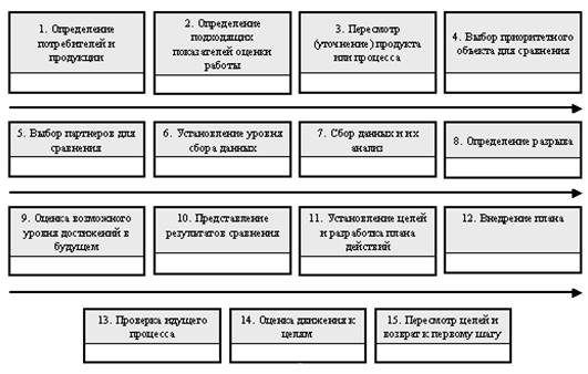 Процесс бенчмаркинга проходит несколько этапов. Сначала определяется потребность фирмы в изменениях — либо после анализа изменений внешней ситуации, либо после сравнения с другой фирмой. Далее проводится оценка эффективности компании, изучаются основные процессы, определяются способы количественного измерения тех или иных характеристик. Затем выбирается партнер, который согласен на проведение исследования, т. е. готов предоставлять данные о себе. В некоторых случаях это может быть исследование ряда компаний в одной или нескольких отраслях, которое позволяет составить «собирательный» образ компании-эталона. Последующий анализ позволяет оценить различия в эффективности, выявить при чины своего отставания, опыт, который можно использовать у себя. Более детально это выглядит следующим образом.