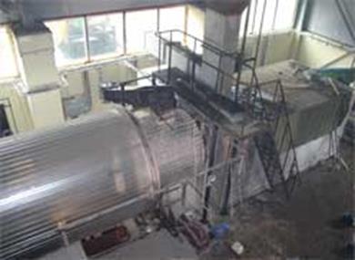 Вид сверху на сушильный барабан. Винтовой конвейер для загрузки сырья (опилки) и газогенератор со смотровой площадкой.