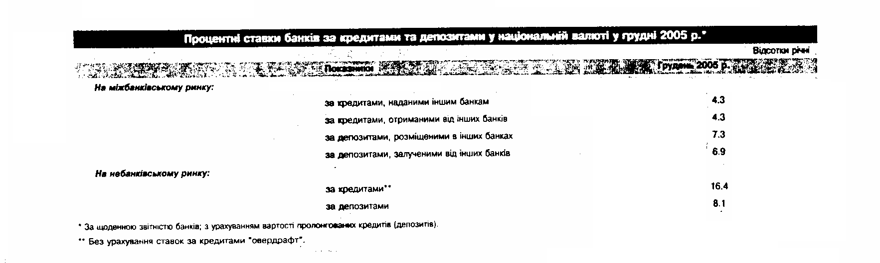 | 5,5 | 5,9 | 6,4 | | и валюте............................................................... а НБУ С/о)............................................................. | 9,5 | 7,0 | 9,0 | | нтстгьских иен (%}... .................. ......................... | 99 | 108 | 112,3 | • Источник: "Бюлетень НБУ" № 2,2005, с. 32, 53,57 (процентные ставки по депозитам средневзвешены в годовом исчислении). Таблица 2 * Выпуск еврооблигаций украинскими банками в 2003-2005 гг. | Названия банков | Даты размещения еврооблигаций | Объемы (млн. дол.) | Сроки (лет) | Процентные ставки (%) | | "ПриватБанк" | 2003 г., декабрь | 100 | 3 | 10,875 | | "УкрСиббанк" | 2004 г., март | 100 | 3 | 10,50 | | "Укрэксимбанк" | 2004 г., сентябрь | 150 | 5 | 7,75 |