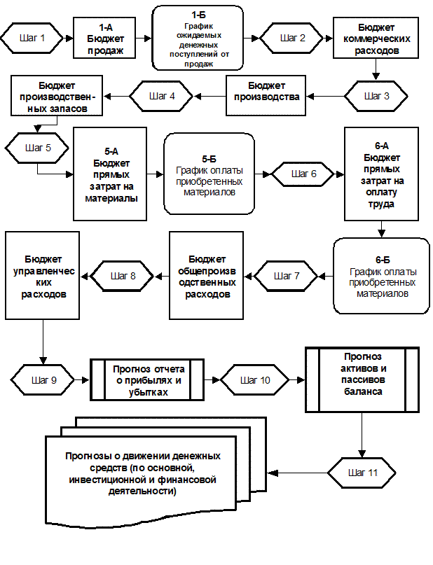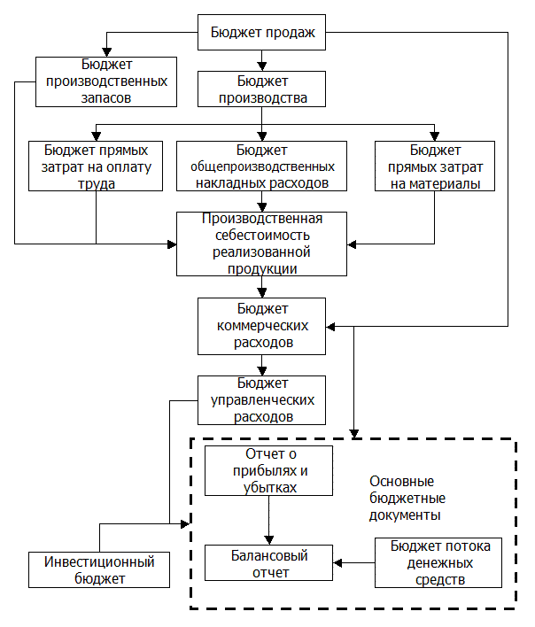Бюджет предприятия (Главный бюджет) представляет собой систему взаимосвязанных бюджетов и в структурированной форме описывает ожидания менеджеров относительно продаж, расходов и других хозяйственных операций в планируемом периоде. Он включает два основных блока: систему операционных бюджетов (плановые сметы основных бизнес-процессов) и систему финансовых бюджетов. Соответственно, с точки зрения последовательности подготовки документов процесс бюджетирования может быть условно разбит на две основных части, каждая из которых является законченным этапом планирования: 1) подготовка операционных бюджетов, 2) подготовка финансовых бюджетов.