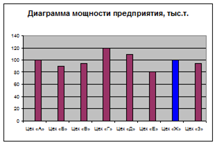 Производственная мощность предприятия рассчитывается по ведущему цеху. Для этого определяются производственные мощности всех цехов и строится диаграмма мощностей предприятия. На рисунке 4.1 изображена диаграмма мощностей в разрезе цехов предприятия.