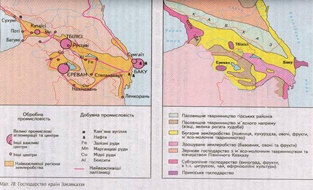 Вирощування тютюну на схилах Кавказьких гір лежить в основі тютюново-ферментаційної промисловості. Важливою галуззю спеціалізації е субтропічне господарство, на базі якого розвиваються чайна та ефіроолійна промисловість, вирощування та переробка цитрусових та інших субтропічних культур. На низовинних ділянках Азербайджану поширене бавовництво та відповідний агропромисловий цикл з переробки бавовни. Гірські території всіх республік спеціалізуються на відгонно-пасовищному тваринництві, переважно вівчарстві.