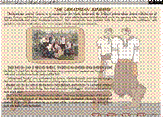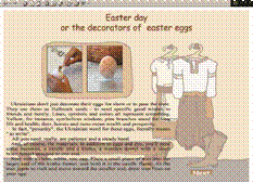Є на сторінці з мал. 2 розділ «Yesterday’s jobs of Ukrainians». Це розділ, в якому описуються деякі з професій, які мали колись українці: писанкарство; бандуристи, кобзарі та лірники; тощо. На мал. 4 перша з сторінок, на яких описується писанкарство. На наступну сторінку можна потрапити натиснувши на кнопку Next. Цикл сторінок про писанкарство закінчується галереєю найкращих робіт учнів нашого ліцею, які за допомогою комп’ютера малювали писанки до Великодня. На мал. 5 одна з циклу сторінок, на яких розповідається про бандуристів, кобзарів та лірників.