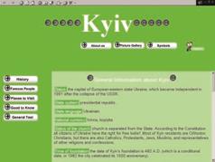 Також на сторінці, яка зображена на мал. 2 є розділ «KYIV». Це посилання на практично окремий посібник з цієї теми. На головній сторінці (мал. 6) є тема посібника, посилання на різні розділи у вигляді двох груп кнопок та загальна інформація про Київ. Першим посиланням є розділ «History» – давні часи, Київська Русь, Козацтво з підрозділами (організація списку розділівпосилань на мал. 7). Приклад однієї з сторінок з розділу «History» зображено на мал. 8, тут можна побачити, що на всіх інформаційних сторінках є завдання для виконання під час опрацювання інформації на сторінці (текст жовтим кольором). Далі на головній сторінці розташований розділ «Famous people» (видатні люди), його підрозділи показано на мал. 9. На сторінці з посиланнями на підрозділи про видатних людей є біжучий рядок з висловом Гребінки про Київ. Про кожного з цих видатних людей далі ви можете дізнатися на сторінках цього посібника (наприклад, про