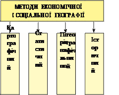 У своїх дослідженнях економічна і соціальна географія використо вує такі основні методи: картографічний, статистичний, порівняльно-географічний, історичний (схема 1