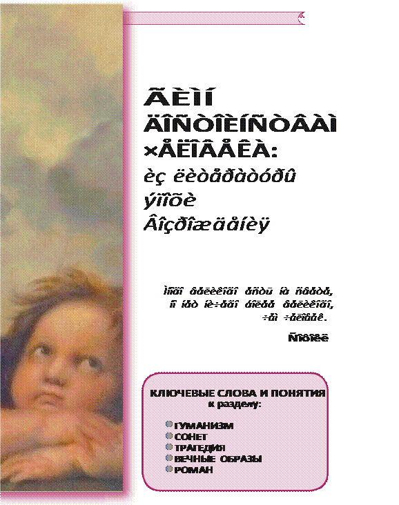 û óæå çíàåòå, ÷òî Âîçðîæäåíèåì (èëè Ðåíåññàíñîì ) íàçûâàþò èñòîðèêî-êóëüòóðíóþ ýïîõó ïåðåõîäà îò Ñðåäíåâåêîâüÿ ê Íîâîìó âðåìåíè, îçíàìåíîâàííóþ áóðíûì ðàñöâåòîì íàóêè è èñêóññòâà (ÕIV — íà÷àëî XVII ââ.) . Ýòî îäíà èç íàèáîëåå ÿðêèõ ýïîõ â èñòîðèè ÷åëîâå÷åñòâà, îêàçàâøàÿ îãðîìíîå âëèÿíèå íà ïîñëåäóþùåå ðàçâèòèå êóëüòóðû. È â íàøè äíè ñâîáîäíóþ ëè÷íîñòü, ñòðåìÿùóþñÿ ê ãàðìîíè÷åñêîìó ðàçâèòèþ, ïîñòîÿííîìó ñîâåðøåíñòâîâàíèþ, ê ïðåîáðàçîâàíèþ ìèðà ñèëîé ðàçóìà è èñêóññòâà, íàçûâàþò «÷åëîâåêîì ýïîõè Âîçðîæäåíèÿ».