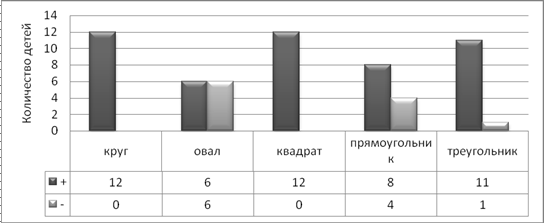 Материал: 6 карт, на каждой из которых в разном порядке расположены 5 фигур – квадрат, прямоугольник, равносторонний треугольник, круг и овал. Размеры: квадрат 2,5 х 2,5 см.; прямоугольник 2,5 х 3,5 см.; сторона равностороннего треугольника равно 2,5 см.; диаметр круга 2,5 см.; Все фигуры наклеенные на одной карте имеют разный цвет. 30 вырезанных фигур – каждая из 5 форм представлена в 4 цветах (размеры: квадрат 5х5 см., прямоугольник 5х7 см., сторона равностороннего треугольника 5 см., диаметр круга 5 см., большой диаметр овала 7 см., малый – 5 см.)