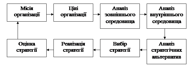 По М. Мескону [51] процес стратегічного управління складається з дев'яти кроків. Це: вироблення місії і цілей організації; оцінка й аналіз зовнішнього середовища; управлінське обстеження сильних і слабких сторін; аналіз і вибір стратегічних альтернатив; реалізація й оцінка стратегії.
