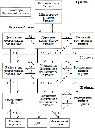 Державне казначейство України доводить до головних розпорядників коштів (ГРК) затверджені обсяги асигнувань. Головні розпорядники коштів готують розподіл бюджетних коштів по областях у розрізі підвідомчих установ, підприємств, організацій і подають до центральної ланки органів казначейства. На підставі розподілу бюджетних коштів Державне казначейство готує реєстри на здійснення видатків з єдиного казначейського рахунка по відповідній території і розпорядження на перерахування коштів. Потім готують платіжне доручення на переказування коштів територіальним управлінням органів казначейства та розпорядникам коштів. Територіальні управління Державного казначейства на своєму рівні доводять до розпорядників коштів отриману суму асигнувань. Вони можуть здійснювати (фінансувати) видатки в межах коштів, отриманих від розпорядника коштів вищого рівня. У свою чергу, територіальні управління Державного казначейства так само працюють із відділеннями Державного казначейства.