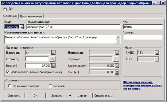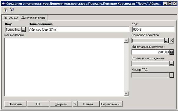 По двойному клику мыши на элементе справочника откроется отдельно диалоговое окно «Сведения о номенклатуре». В этом окне проводится редактирование и ввод новой информации по данному элементу. Окно имеет две вкладки «Основные» и «Дополнительные».