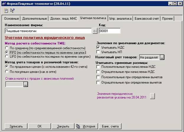 Потребность в использовании партионного учета возникает на предприятии, когда появляется необходимость либо группировать какие-либо товары по определенному признаку, либо делить какой-либо товар по определенному признаку. Партионный учет ведется раздельно для каждого материально ответственного лица. Метод расчета себестоимости устанавливается для каждого собственного юридического лица. Чтобы установить метод расчета себестоимости достаточно зайти в справочник «Фирмы», выбрать юридическое лицо и перейти на вкладку «Учетная политика».