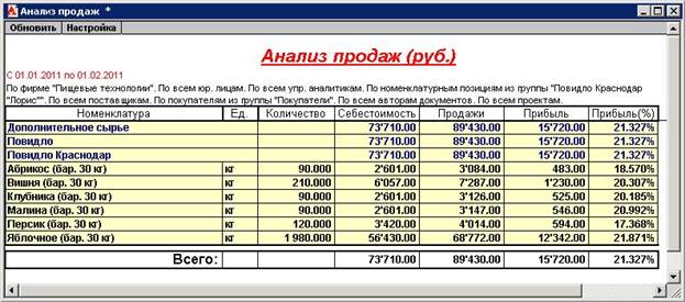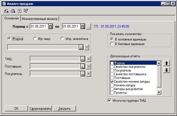 Отчет о продажах можно сформировать как по каждой фирме так и по всей компании в целом. Можно также сформировать отчет по юридическому лицу или по конкретному аналитическому признаку управленческого учета.