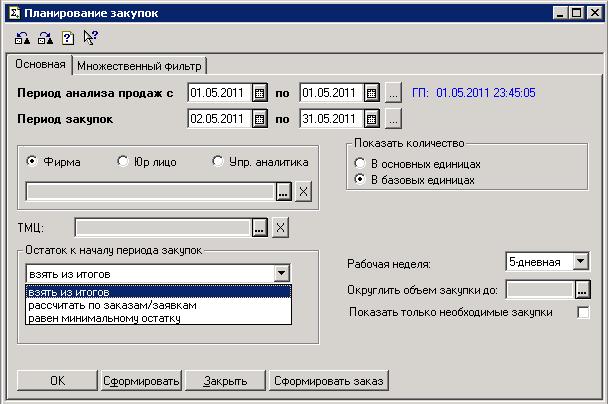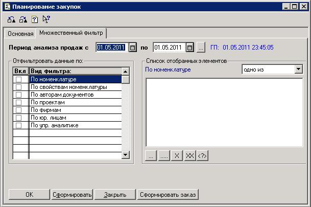 Рис. Отчет «Планирование закупок» вкладки «Основная» и «Множественный фильтр»