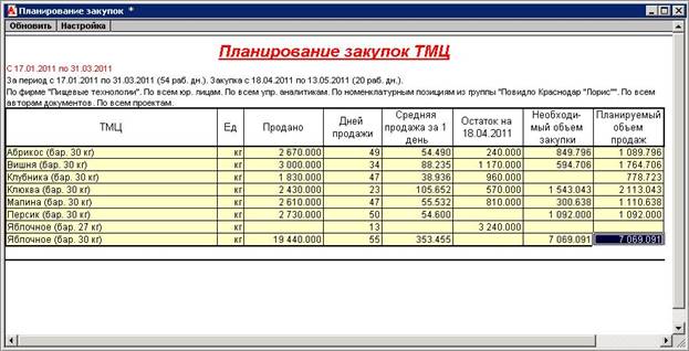 В отчете «Планирование закупок» задаются период анализа продаж и период планирования закупок. Период анализа продаж — это тот период, на основании продаж за который рассчитывается средняя скорость продаж ТМЦ за день. На основании этой скорости продаж вычисляется предполагаемый объем продаж ТМЦ на период планирования закупок. По предполагаемому объему продаж и начальному складскому остатку рассчитывается количество ТМЦ, которое следует купить, чтобы к концу периода планирования закупок на складе осталось оптимальное количество ТМЦ, равное минимальному остатку. Правильный выбор границ периода анализа продаж позволяет достигать наиболее точной оценки предполагаемого объема продаж. Так, для ТМЦ, уровень продаж, которых не подвержен сезонным колебаниям и в среднем в течение всего времени остается на одном и том же уровне, следует выбрать максимально большой период анализа, например, за один год.