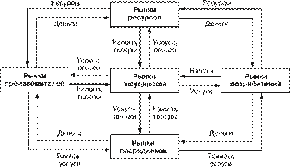 — коммерческим обменом ценностями между двумя сторонами. Од& нако существует обмен и без участия денег — бартер, при котором про& исходит обмен ценностями (например, товарами). Любая экономика представляет собой совокупность рынков, объединенных обменными процессами (рис. 3).